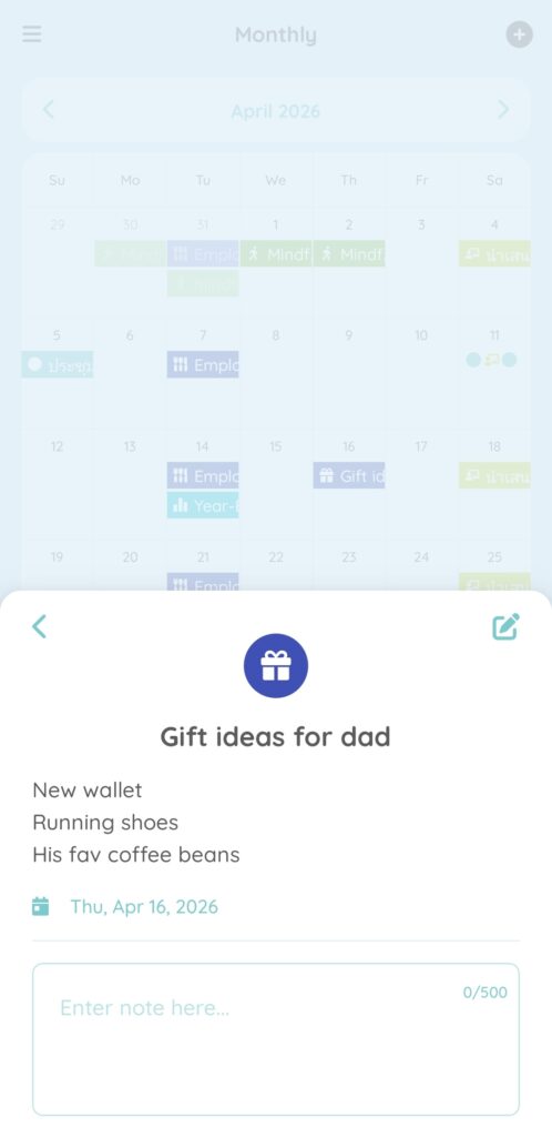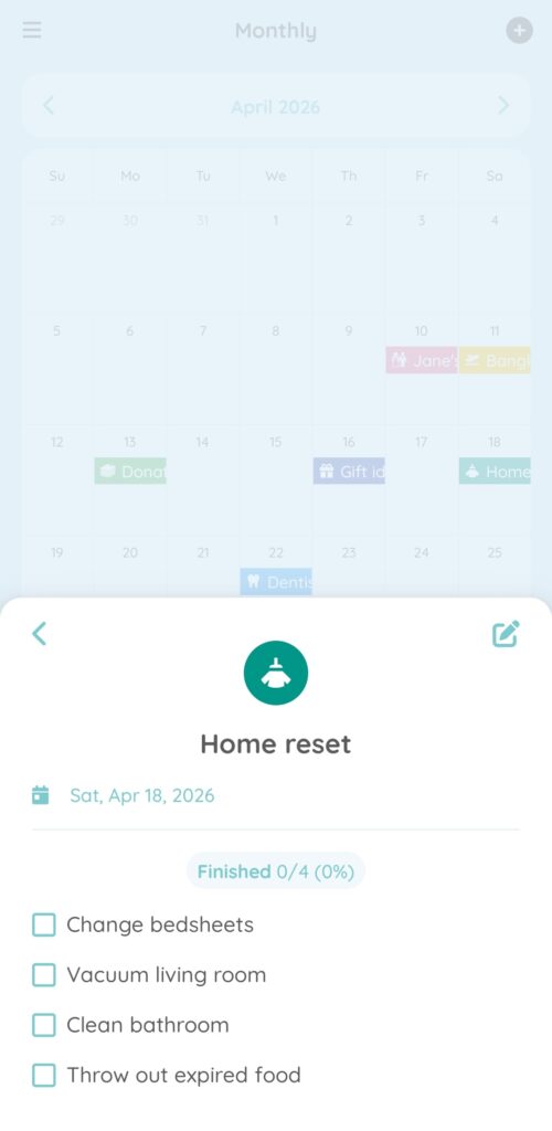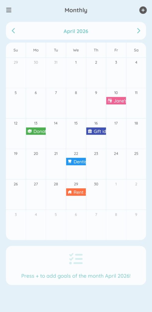 When important dates are visible early, nothing sneaks up on you. You don’t suddenly realize: A birthday is tomorrow, or rent is due in two days. It gives you time to spread the effort. For example: If rent is due April 29, you could review budget on April 10 or transfer the funds on April 20.